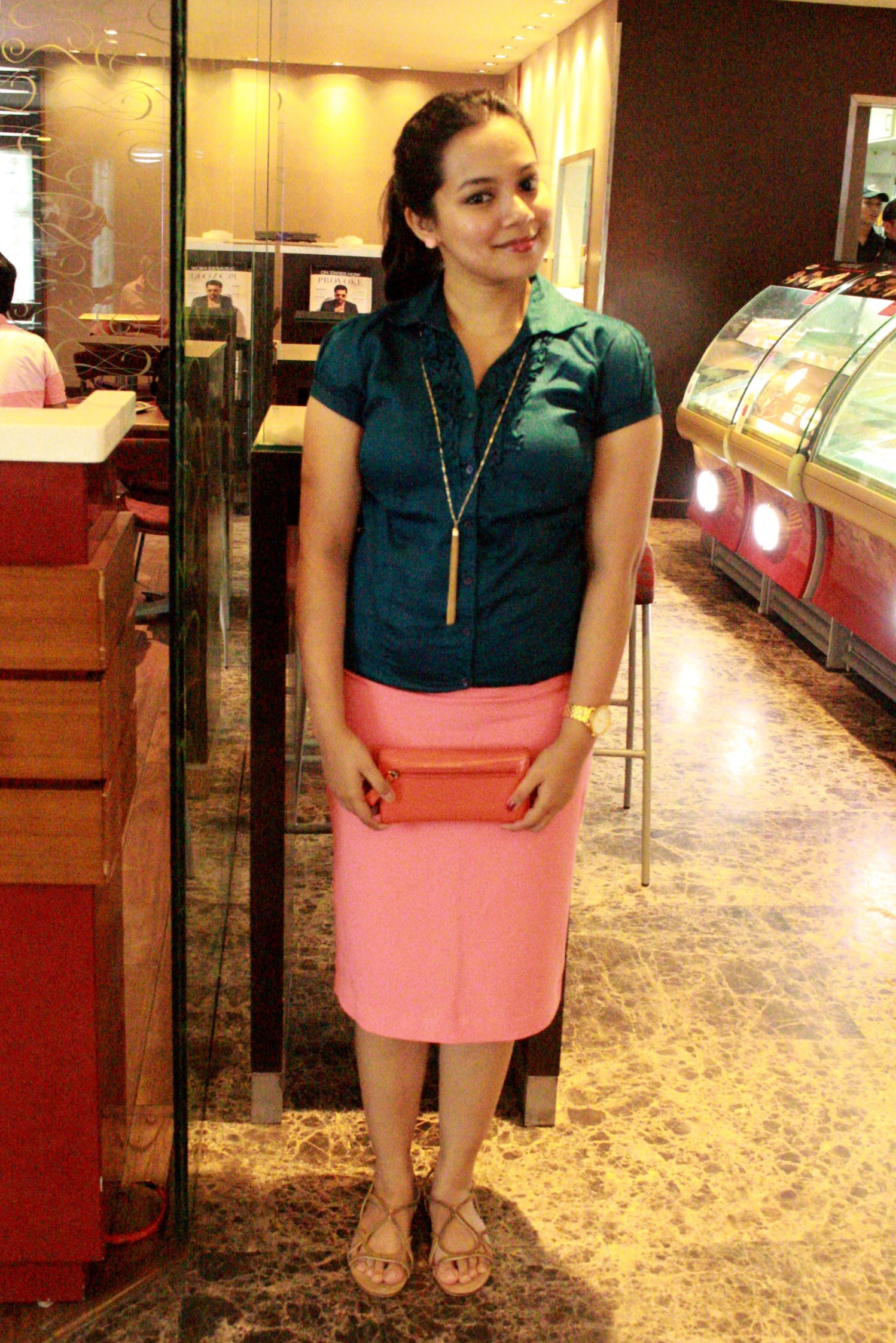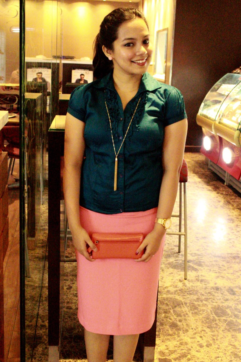 For the formal look I kinda toned down my bright coral-peach skirt with a teal shirt which hit the right length such that it covered the problem areas well enough 👍