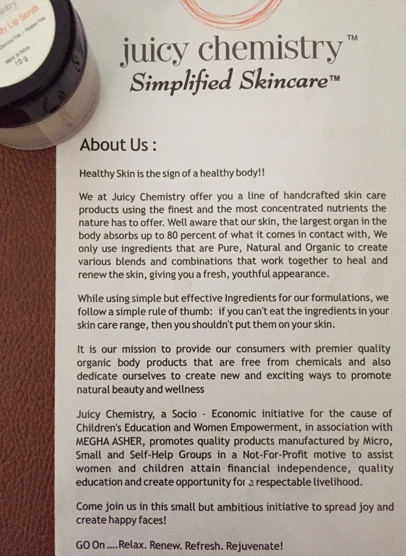 This is from the JuicyChemistry range of skincare products which is a start up making so much progress in the skincare space today. They are based out of Coimbatore and this is what they have to say about their skincare line: