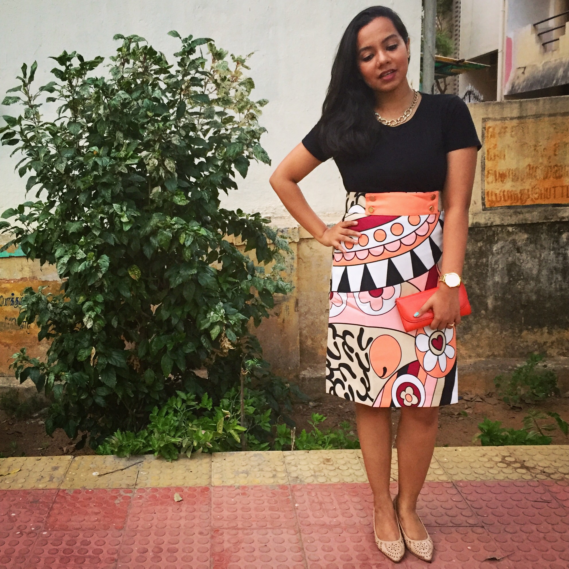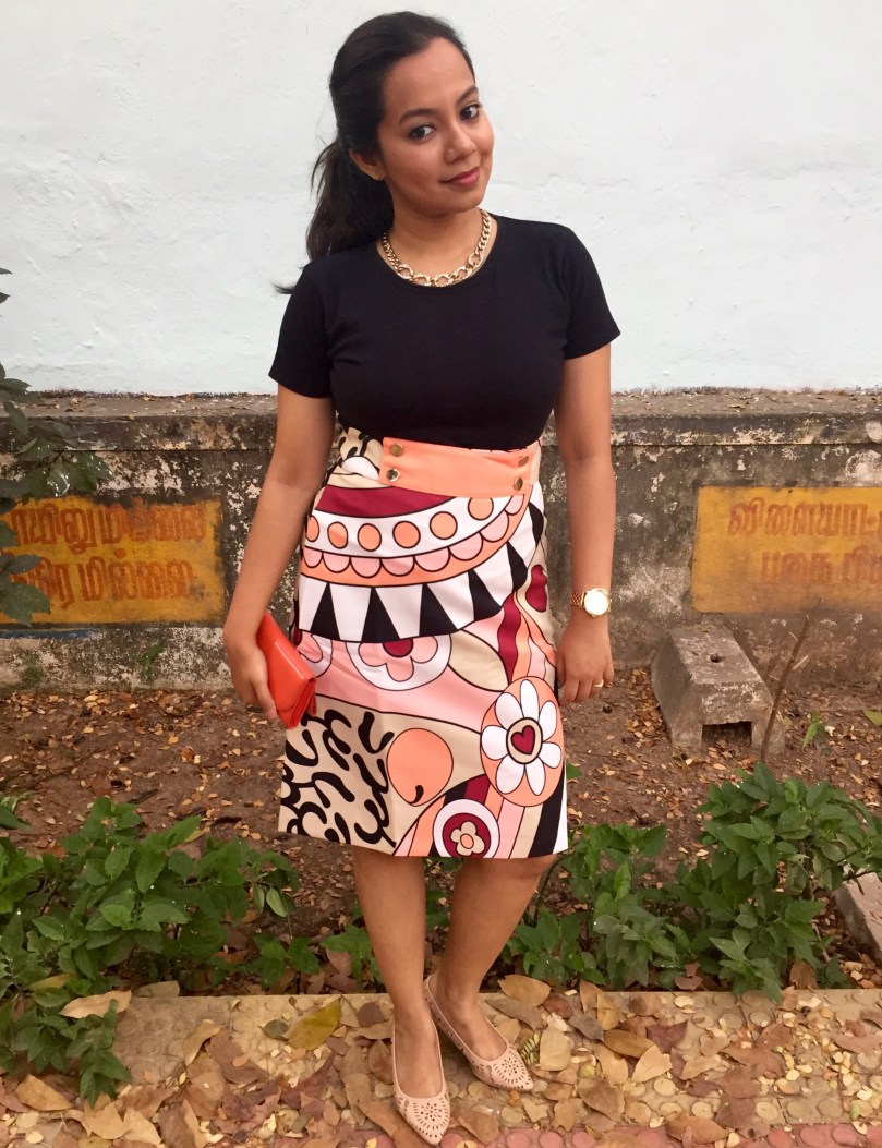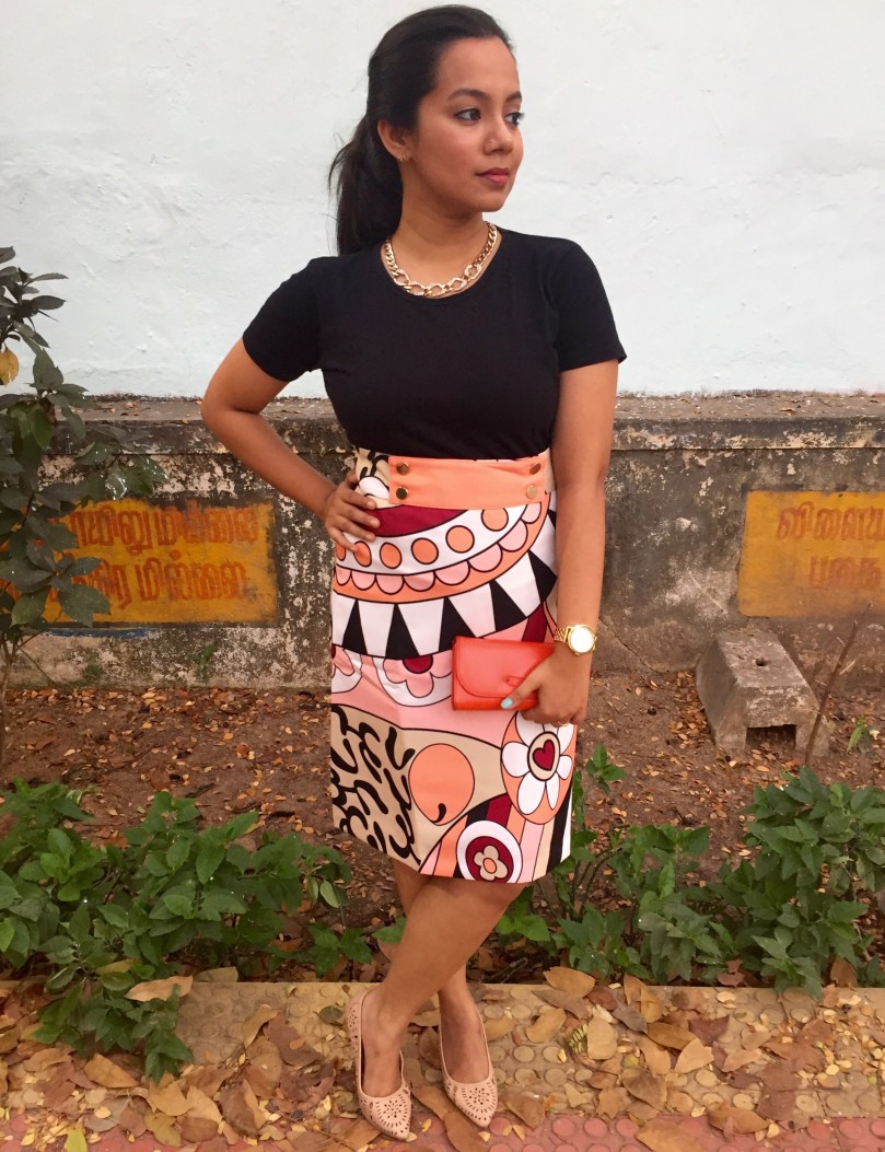 Outfit Details – A-line skirt : Bysi from Amazon.in (psst…just checked, it’s still on a 70% off! Run!) Black T-shirt : Globus, Nude Pumps : Westside, Gold link chain : Gift, orange Clutch : Capresse, Watch : Tommy Hilfiger