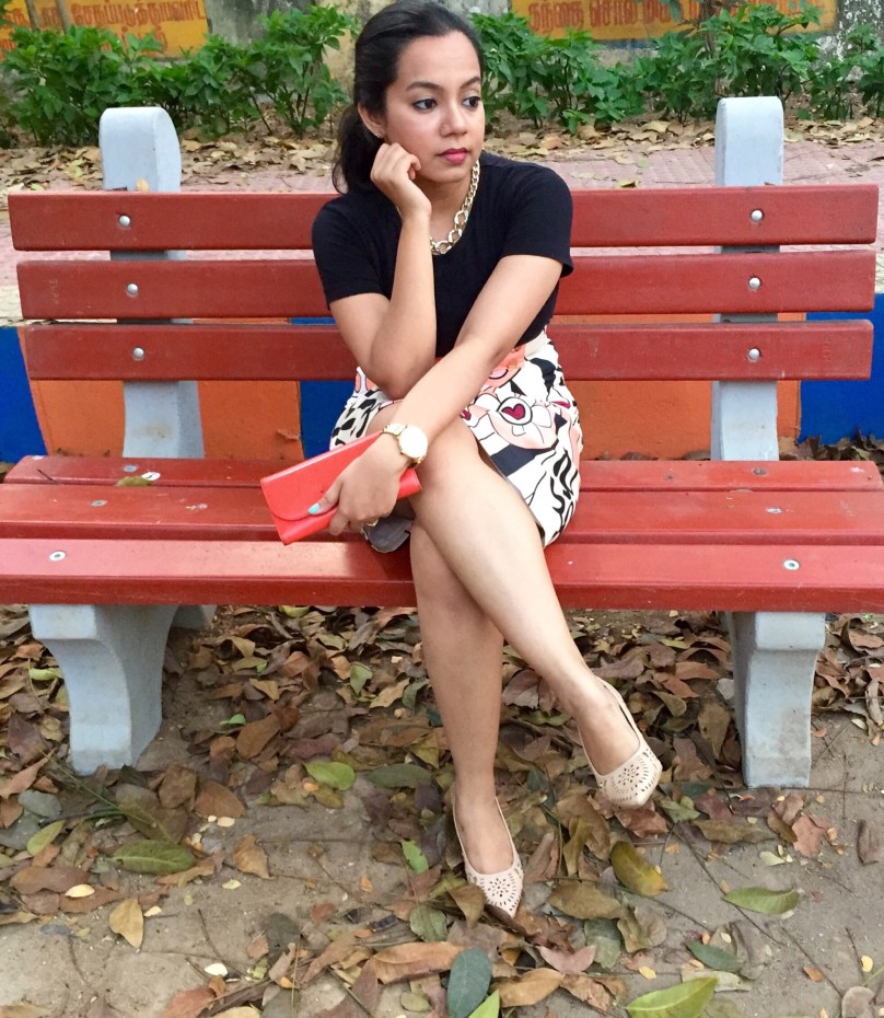 The clutch, my sister’s was a last minute addition because I thought the tomato red/orange went well with the peach tones in the skirt! For shoes I wore my trusted nude pumps and completed the look!