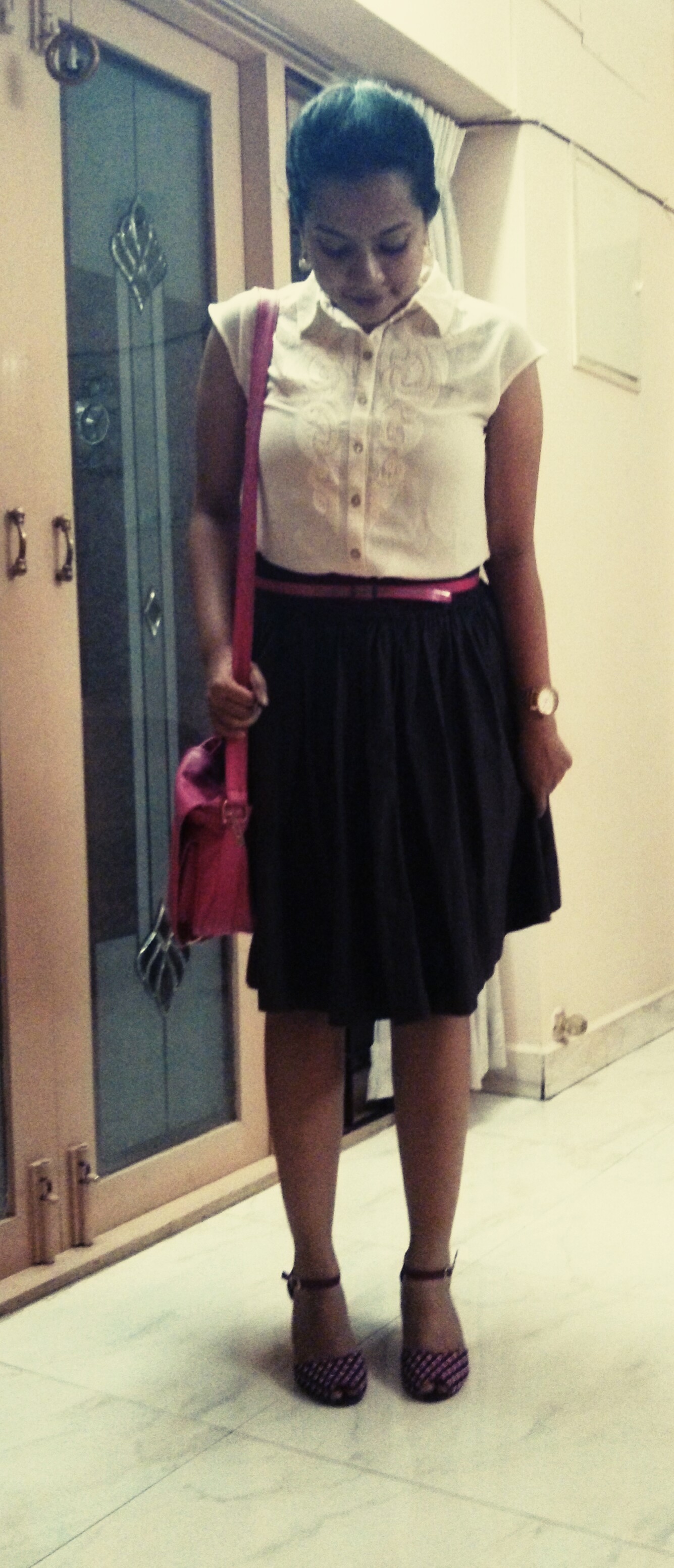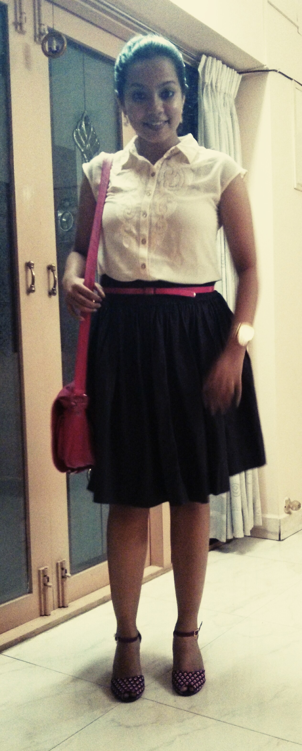 Outfit Details : Skirt – Material from RmKV, Chennai and designed and stitched by my Tailor, Top – Shilpi CP Ramasamy Salai, Heels -Flipkart, on my lips – Lakme Absolut hi-Definition Matte in the shade Pink Caress