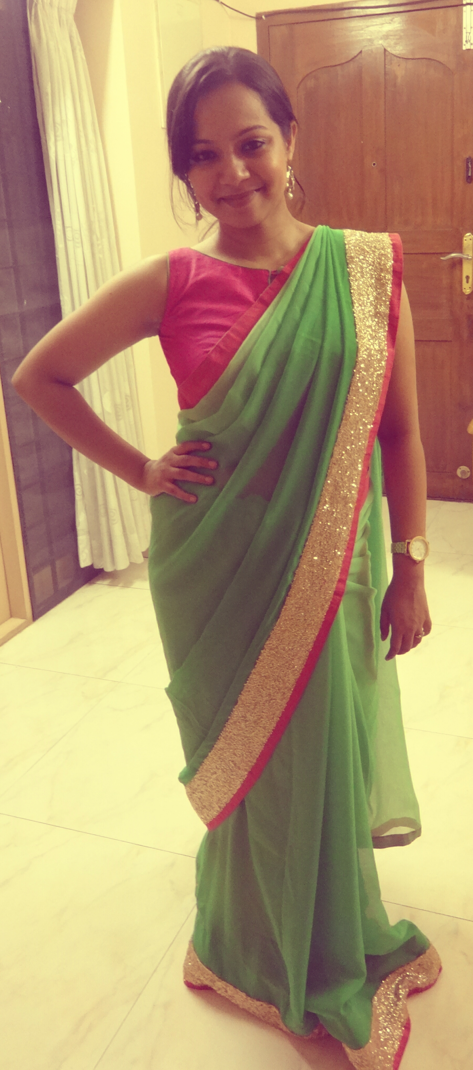 While I individually love the blouse and the skirt I hate, with all vehemence I can muster, the Dhavani or the green brocade portion of the attire. So I decided to tone down the whole look by just using the skirt giving this look a much needed twist!